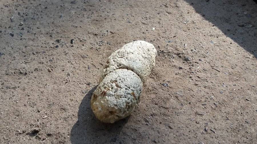 - Оформленный кал с белым налетом или рассыпчатая, твердая светлая какашка (белый рассыпчатый кал) говорят об избытке в рационе костей, хрящей и жил. Также белый налет на кале может свидетельствовать о развитии в кишечнике простейших.