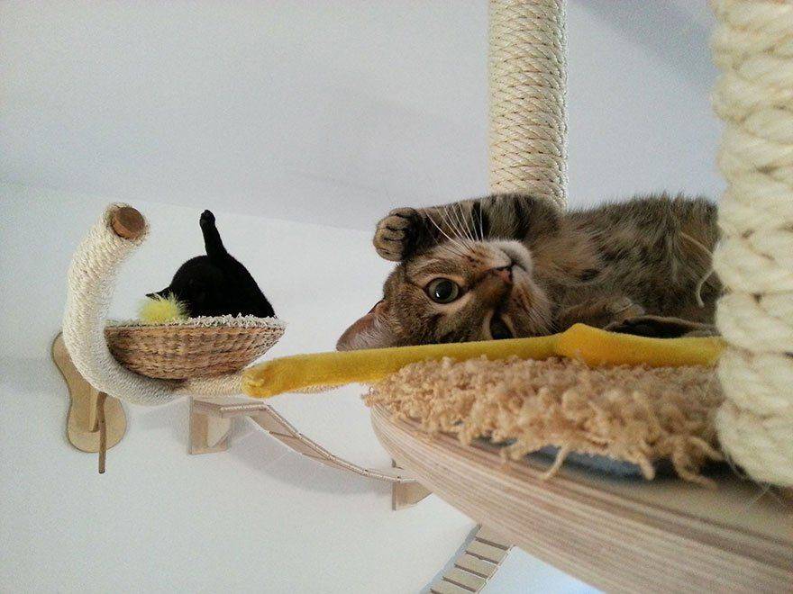 При желании вы можете оборудовать кошачье место для отдыха, здесь понадобятся специальные домики, игрушки, лежанки и т.д.
