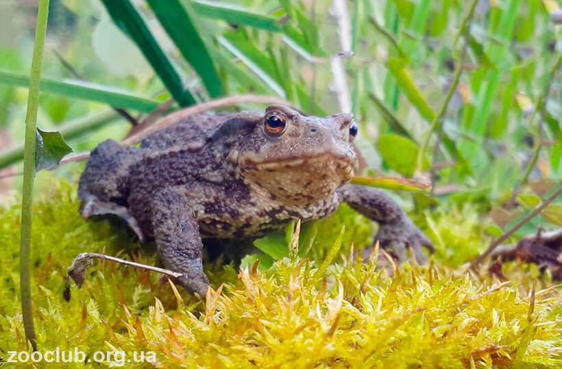 Обыкновенная земляная жаба – самый крупный вид. Туловище половозрелой жабы грузное и широкое, окрас коричневый или сероватый. Глаза земноводного оранжевые.
