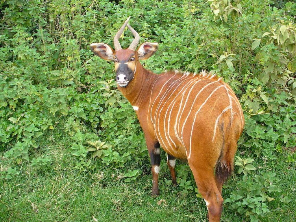 Довольно крупная антилопа с длинными закрученными спиралью рогами. Обитает в лесах, расположенных в центре Африканского континента. Бонго легко узнать по необычной полосатой окраске: на каштаново-рыжей шерсти животного по всей длине тела имеются хорошо заметные светлые поперечные полосы.