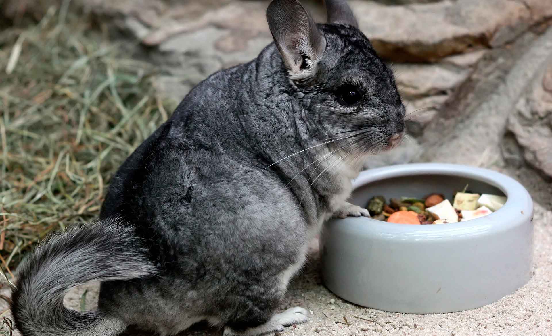 Кормление шиншилл в неволе должно быть максимально приближенным к их рациону в естественной среде. Это травоядные зверьки, поэтому основу их меню составляют злаки и сено. Промышленное питание для шиншилл представлено в виде зерновых или гранулированных смесей, которые кроме злаков содержат полезные травяные добавки и минералы. Грызуна кормят раз в день, обычно в вечернее время, насыпая в мисочку 2-3 столовых ложки корма.