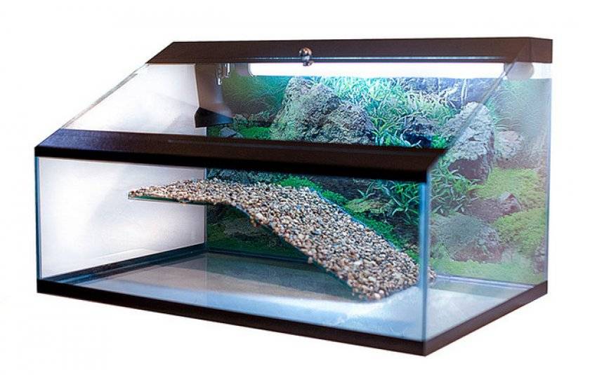 Суша нужна рептилиям для отдыха и принятия «солнечных» ванн, здесь они просушивают свое тельце под ультрафиолетовыми лампами и греются после водных процедур. Чтобы любимцы не убежали, не располагайте искусственные островки ближе 30 см от края аквариума и позаботьтесь о прочной крышке для террариума с вентиляционными отверстиями. Красноухая черепаха в домашних условиях требует бассейна с глубиной водного слоя от 40 см. Островки делают прочными, с грубым грунтом и уклоном от дна, можно использовать готовые магазинные конструкции.