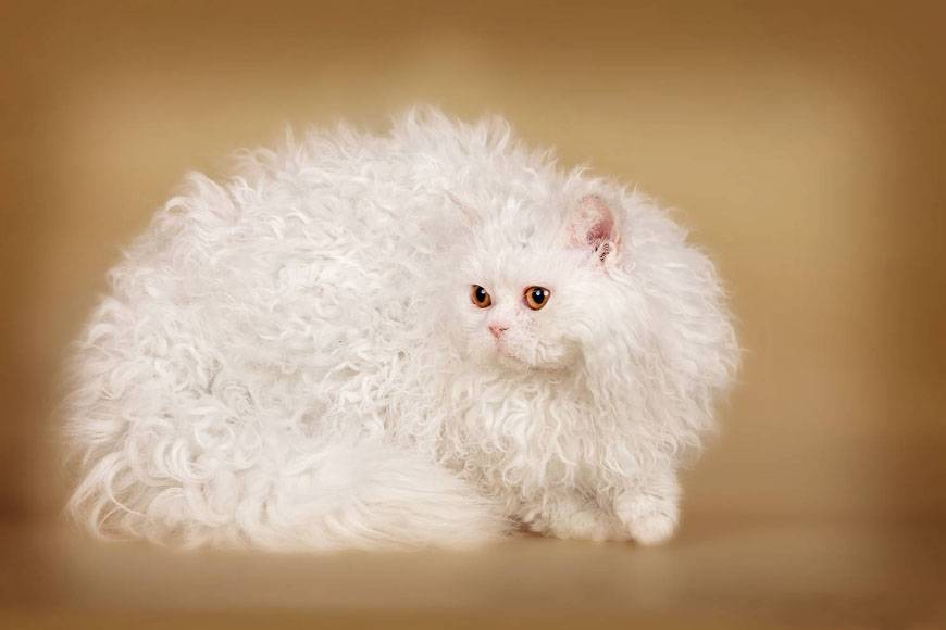 Белый кот с жёлтыми глазами породы селкирк-рекс похож на очаровательную овечку или пушистое облачко — каждый волосок такой кошки имеет мягкий завиток, придавая шубке объём и волнистую структуру. В отличие от других рексовых пород, селкирк отличается более крупным и тяжёлым костяком, слегка недовольным выражением мордочки и миролюбивым, ласковым характером. Селкирк-рекс может быть как длинношёрстным, так и короткошёрстным.
