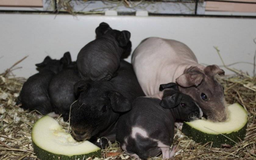 Бесшерстные или лысые морские свинки обладают наименьшей продолжительностью жизни из всех разновидностей. В среднем они живут 5 лет, но при должном содержании этот срок можно продлить до 8 лет (как максимум). В эту категорию входит порода скинни, а также не менее распространенная болдуин. Эти гипоаллергенные разновидности появились стараниями селекционеров. Они полностью лишены шерстного покрова, вследствие чего легко простужаются. Изначально они жили столько же, сколько хомячки, но селекционеры усовершенствовали выведенную разновидность, благодаря чему лысые свинки получили более долгую жизнь.