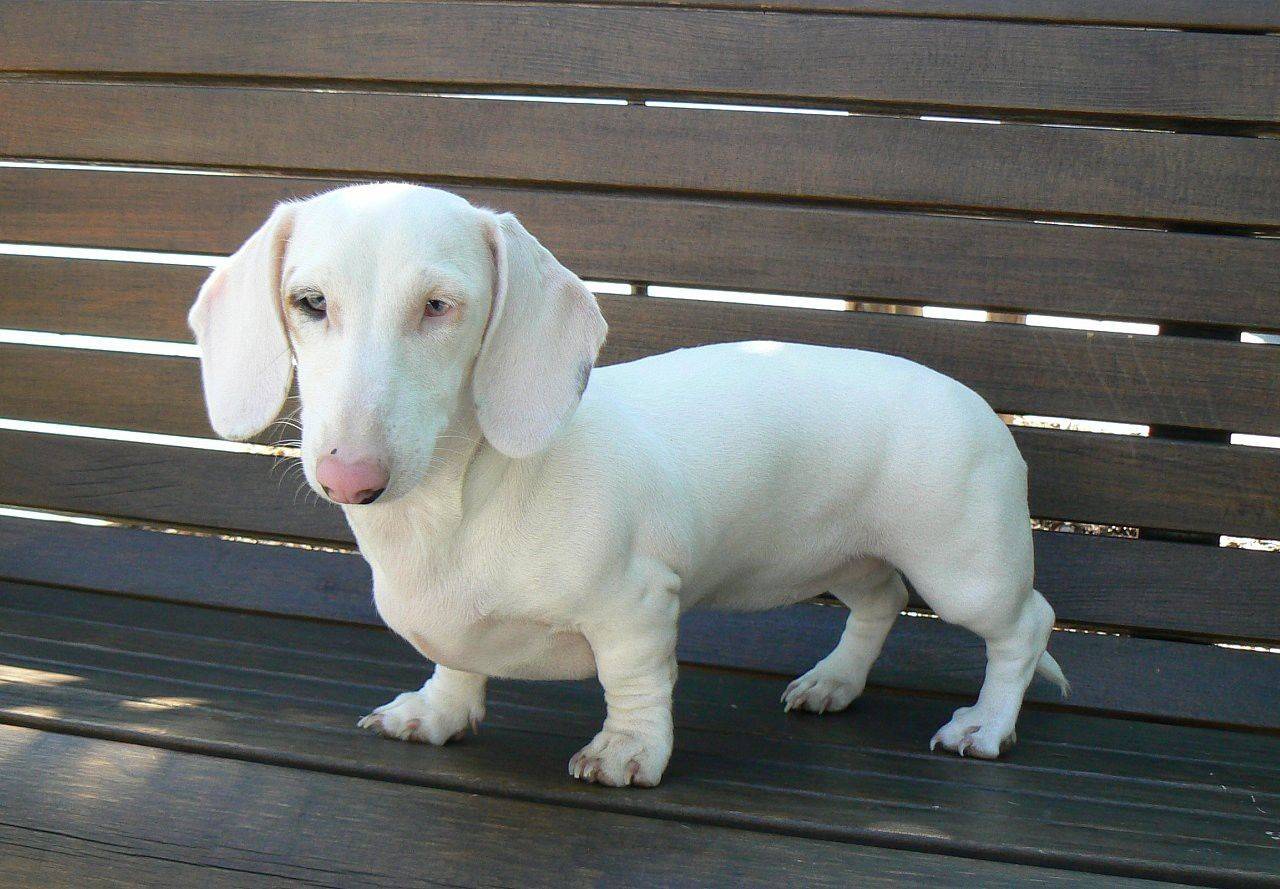 Встретить таксу в полностью белым окрасом шерсти — большая редкость. Смотрите фото.