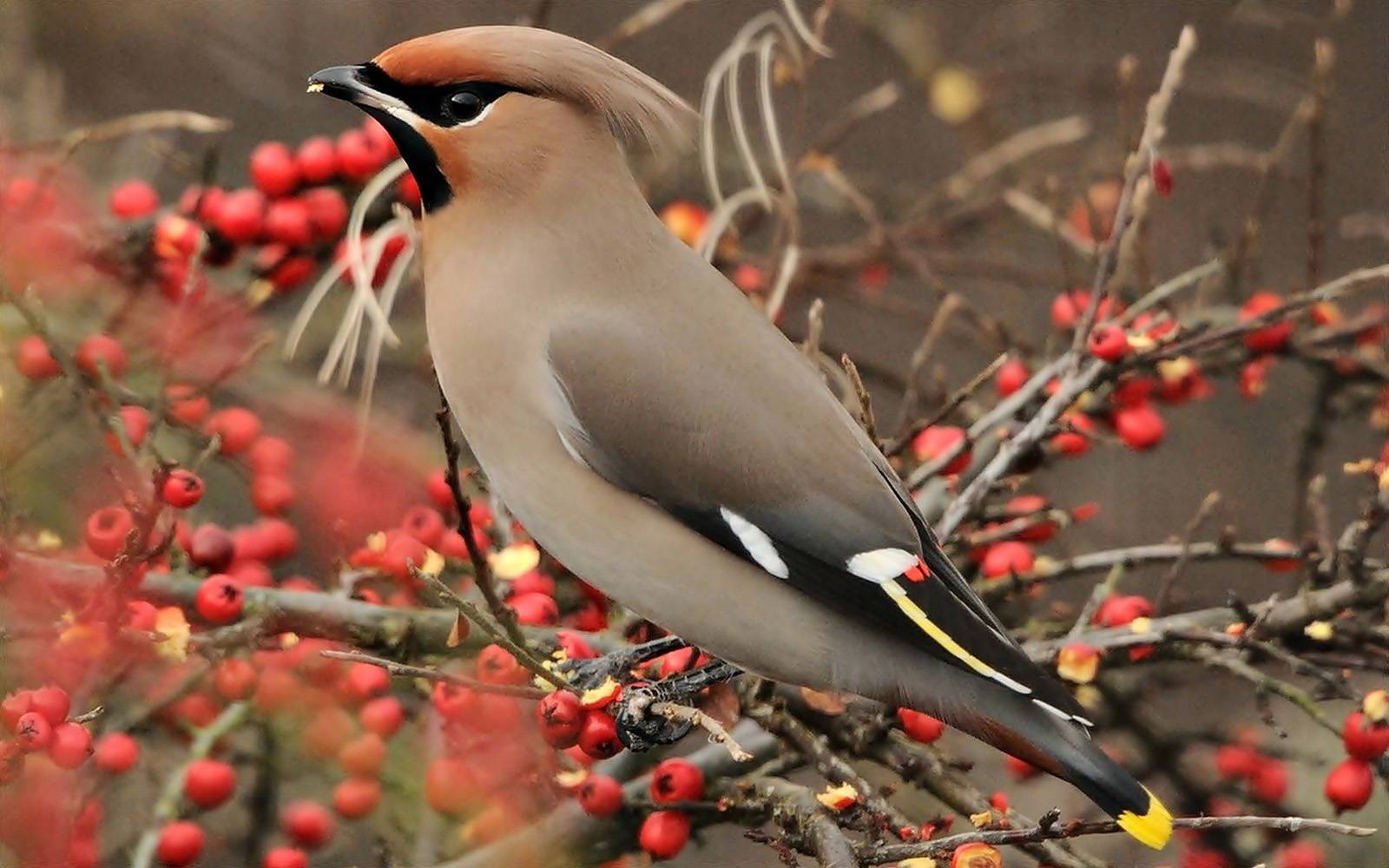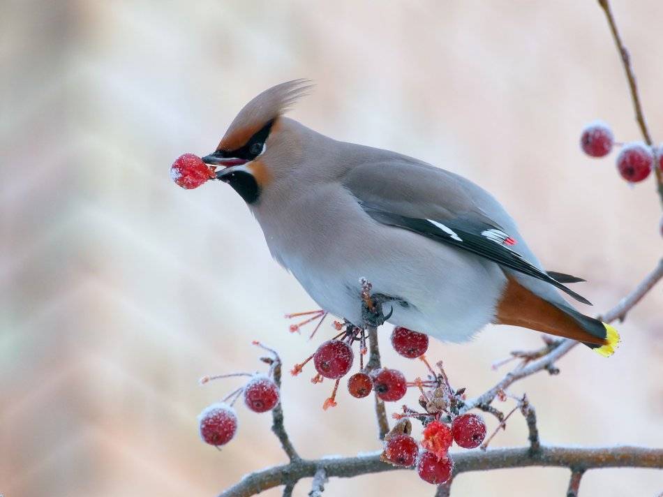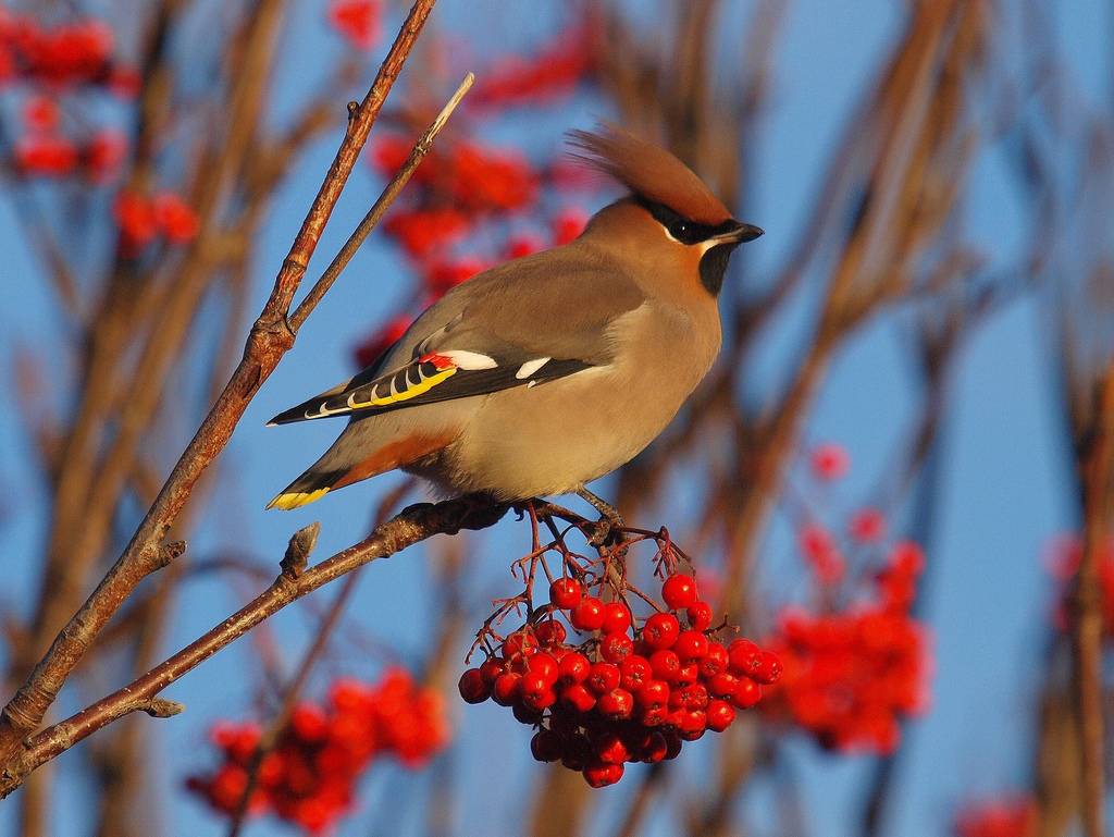 Теперь Вы знаете где живет птица свиристель. Давайте же посмотрим, что она употребляет в пищу.
