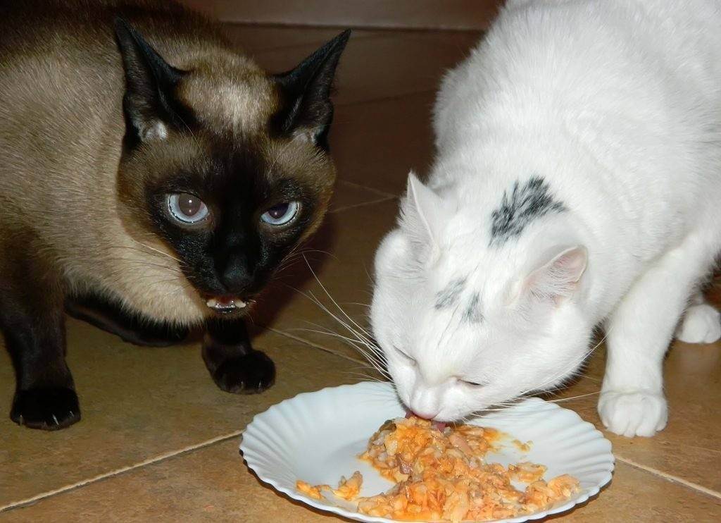 Важно, чтобы и кот, и кошка принимали пищу одновременно, это отвлечёт их на некоторое время от проявления внимания друг к другу. Кормить кота и кошку нужно только одинаковой едой, порции при этом должны быть равными для обоих питомцев. В период, когда у кота и кошки раздельное питание, миска питомца, длительное время находящегося в доме, должна обязательно находиться на своём месте, а иначе животное может начать нервничать, перестать принимать пищу или проявлять агрессию по отношению к новому домочадцу