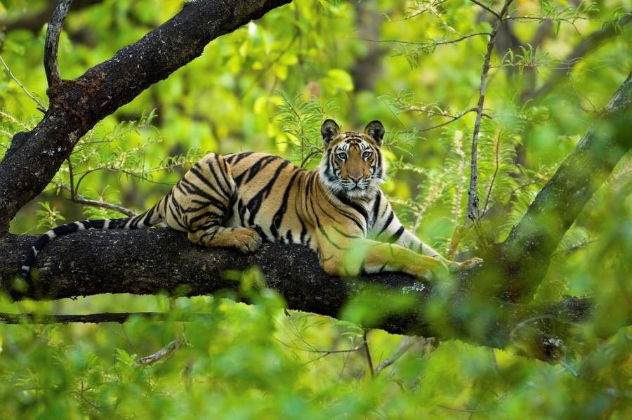 Фото: Nick Garbutt/PantheraТигры прекрасно лазают по деревьям, но не очень комфортно чувствуют себя на ветках. Гораздо увереннее они стоят всеми четырьмя лапами на земле.