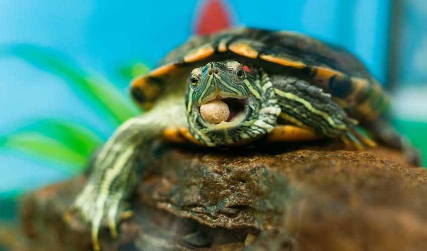Если вы не знаете, чем кормить красноухую черепаху, какие корма выбирать для получения витаминов, актуально будет разнообразие рациона. В принципе, все витамины для черепах красноухих содержатся в пище, редко нужно употребление специализированных витаминных комплексов. Источником витамина А для водных видов рептилий могут стать говяжья печень и рыба, у которой не удалены внутренности. Кальций водные рептилии могут получать, если в их рационе будут присутствовать новорожденные или молодые мыши, креветки, улитки, рыба с костями, мальки и лягушата. Также в качестве дополнительного источника кальция используют сепию, размельченный мел или специальные кальциевые блоки. Черепахам, обитающим в воде, разрешается давать яичную скорлупу, но в малых количествах, предварительно ее прокалив (можно также проварить).
