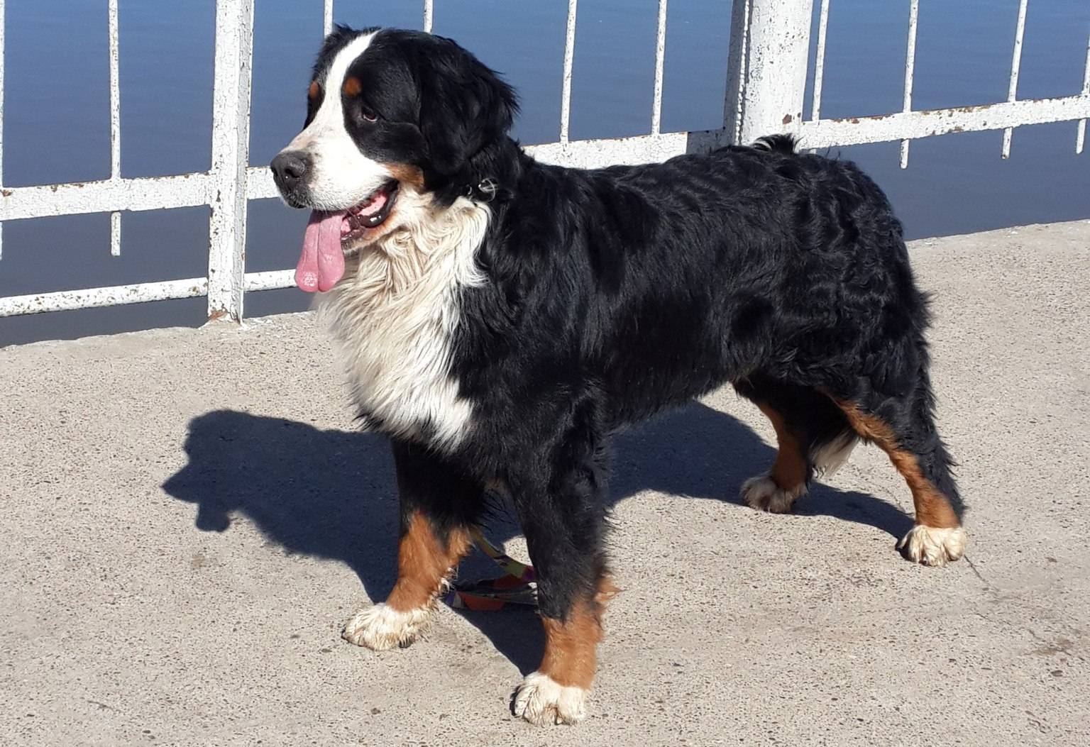 - Бернский. Высота в холке достигает 70 см. Это хорошо сложенная собака с развитой мускулатурой. Основной цвет окраса — черный. Длинношерстная разновидность. У здорового пса она шелковистая, волнистая и блестящая. Коричневые подпалины размещены над глазами, в области живота, вокруг заднего прохода и на лапах. Белые отметины разделяют голову и морду, полосы есть на груди.
