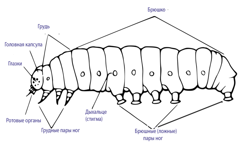 Из яичек появляются личинки — гусеницы. Они активно питаются, растут и накапливают вещества на следующие превращения.