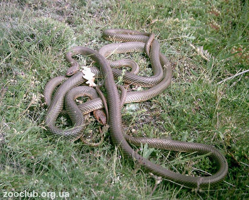 Dolichophis cypriensis – кипрский полоз отличается оливковым, серо-коричневым окрасом с белыми точками по спине. Хвост всегда однотонный, без отметин. Вырастает до 1-1,15 метра.